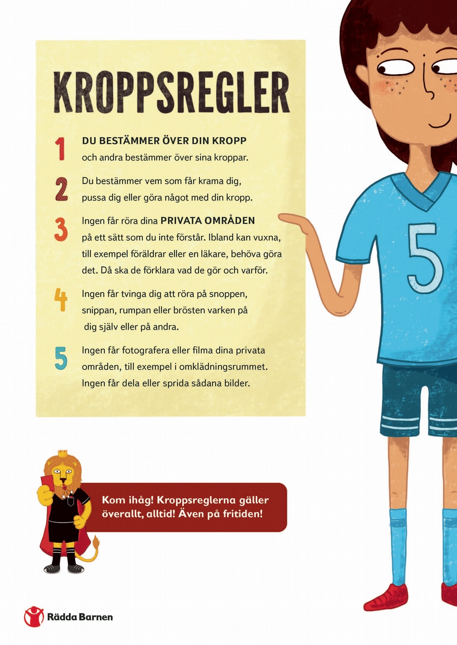 Material framtaget för ledare inom idrotten eller annan verksamhet som vänder sig till barn mellan 7 och 12 år. Materialet syftar till att hjälpa ledare att tala med barnen om frågor som känslor, privata områden och samtycke.